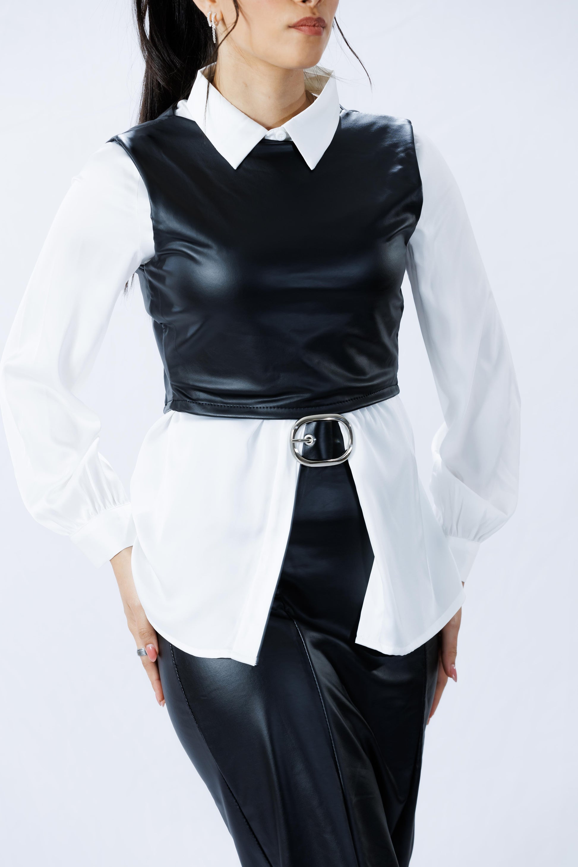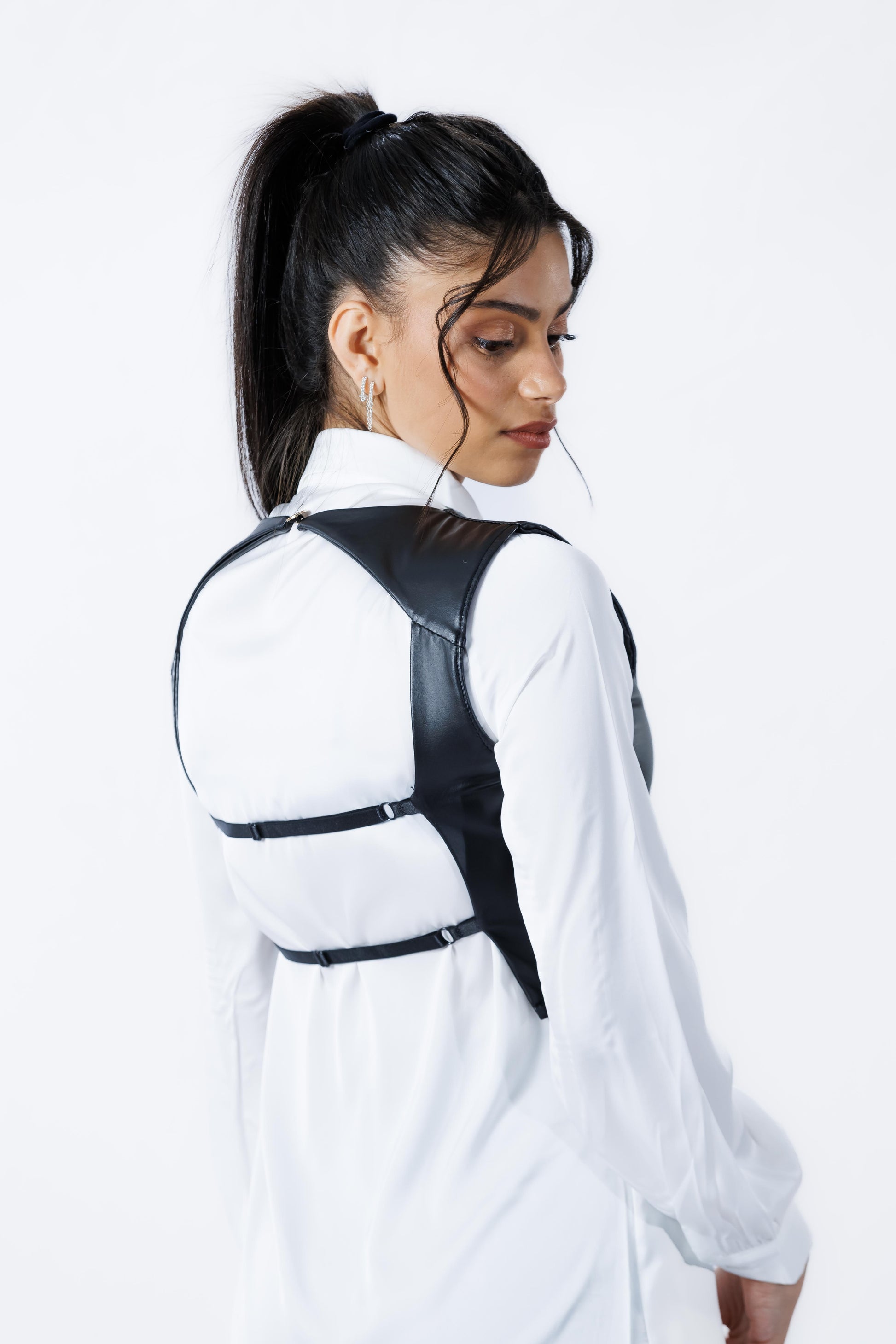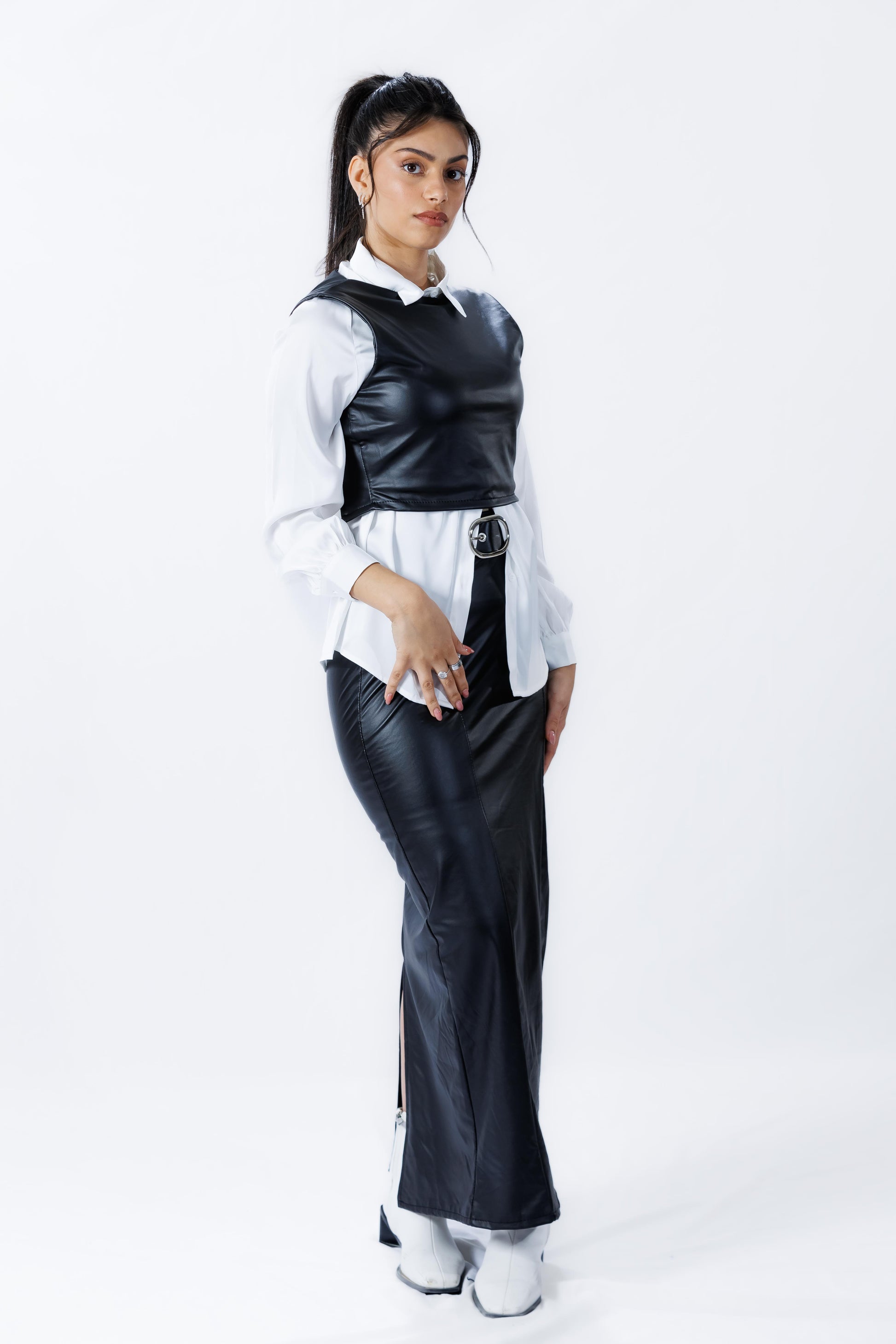 חליפת “מור” היא חליפת עור אלגנטית המתאפיינת בעיצוב מינימליסטי ומרשים. החלק העליון של החליפה הוא ללא שרוולים ומגיע עד המותן. החצאית התואמת מגיעה בגזרה מחמיאה, עם חגורה מותאמת להדגשת המותן ושסע קטנטן מאחור, שמוסיף נופך של תחכום לנוחות ולמראה.