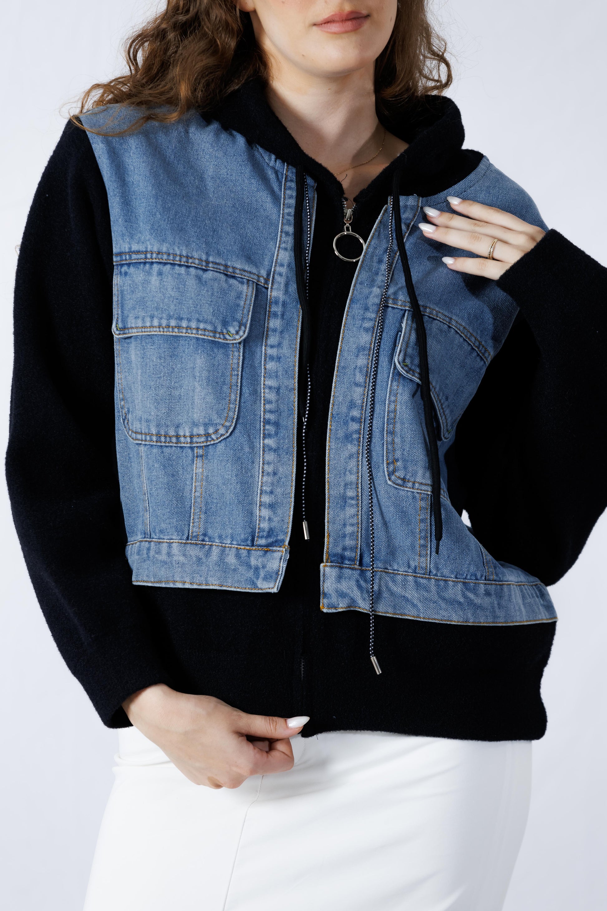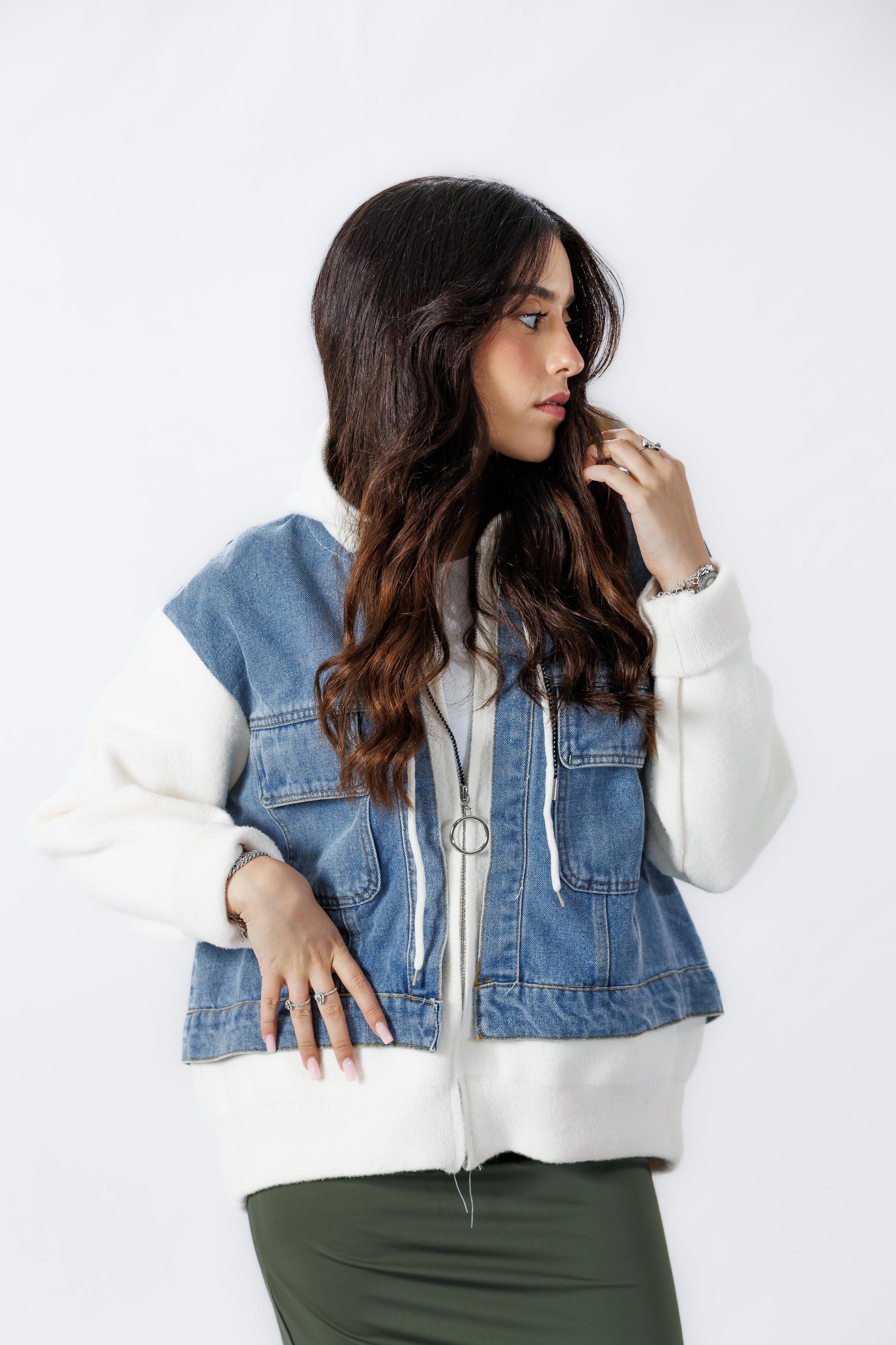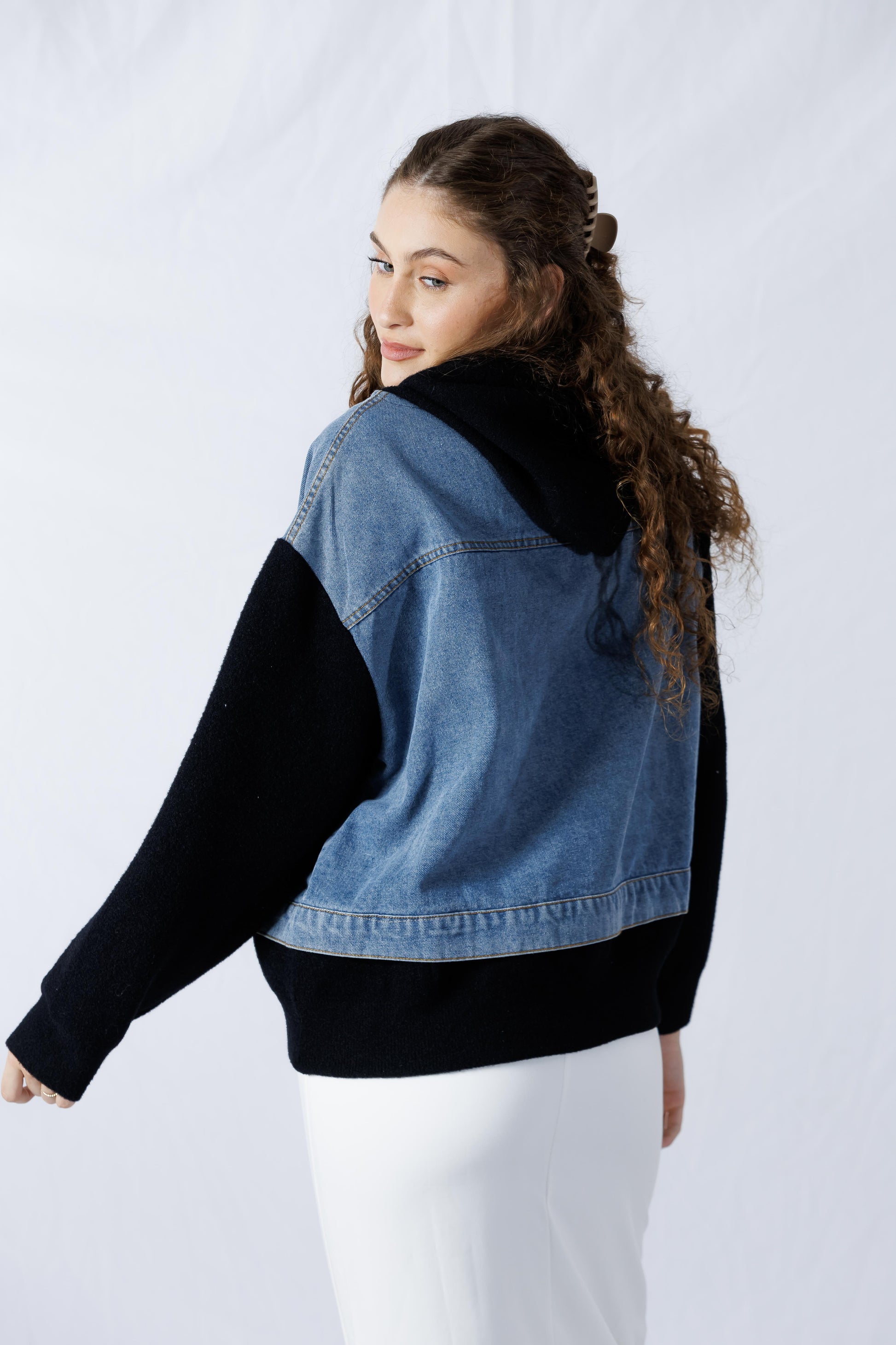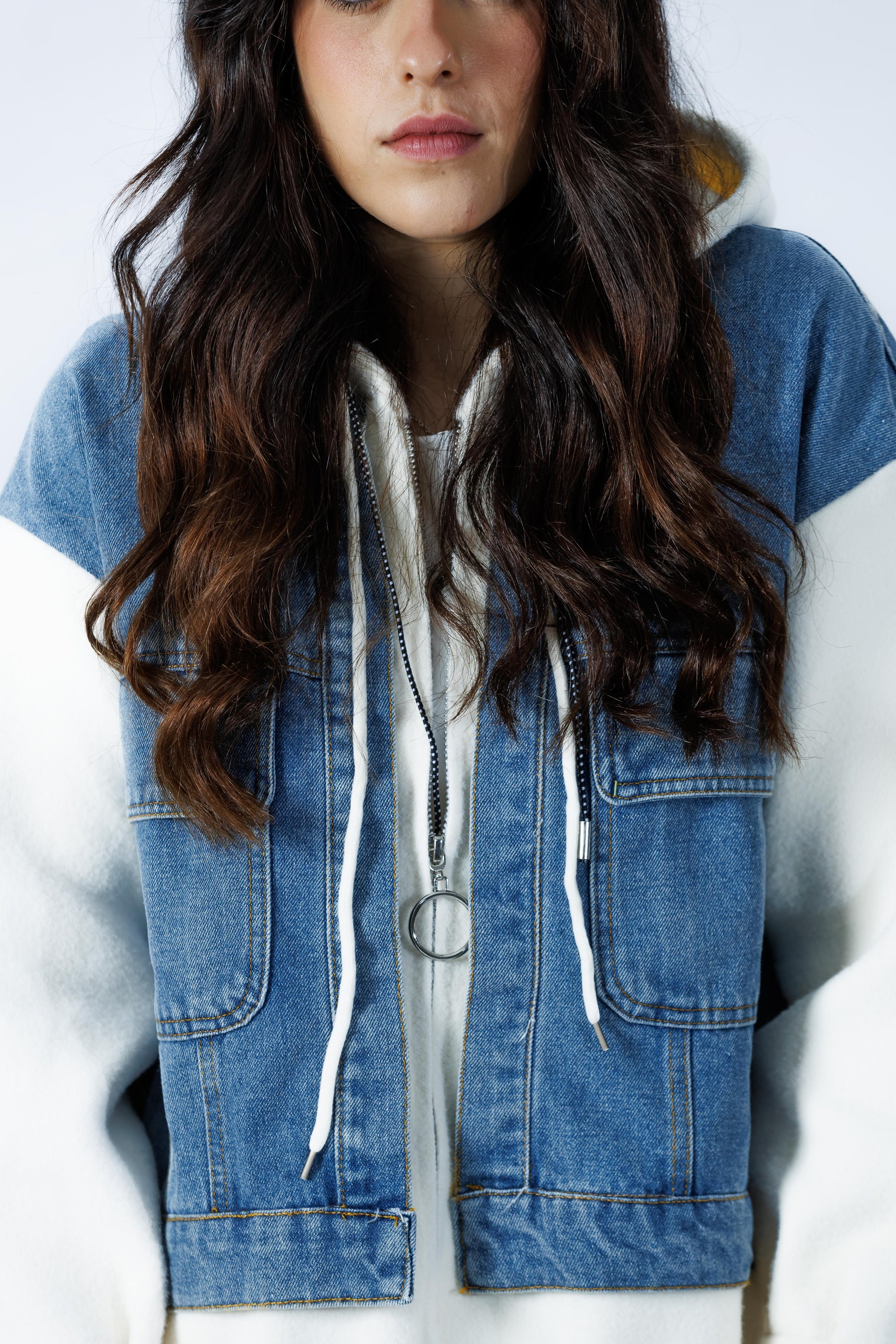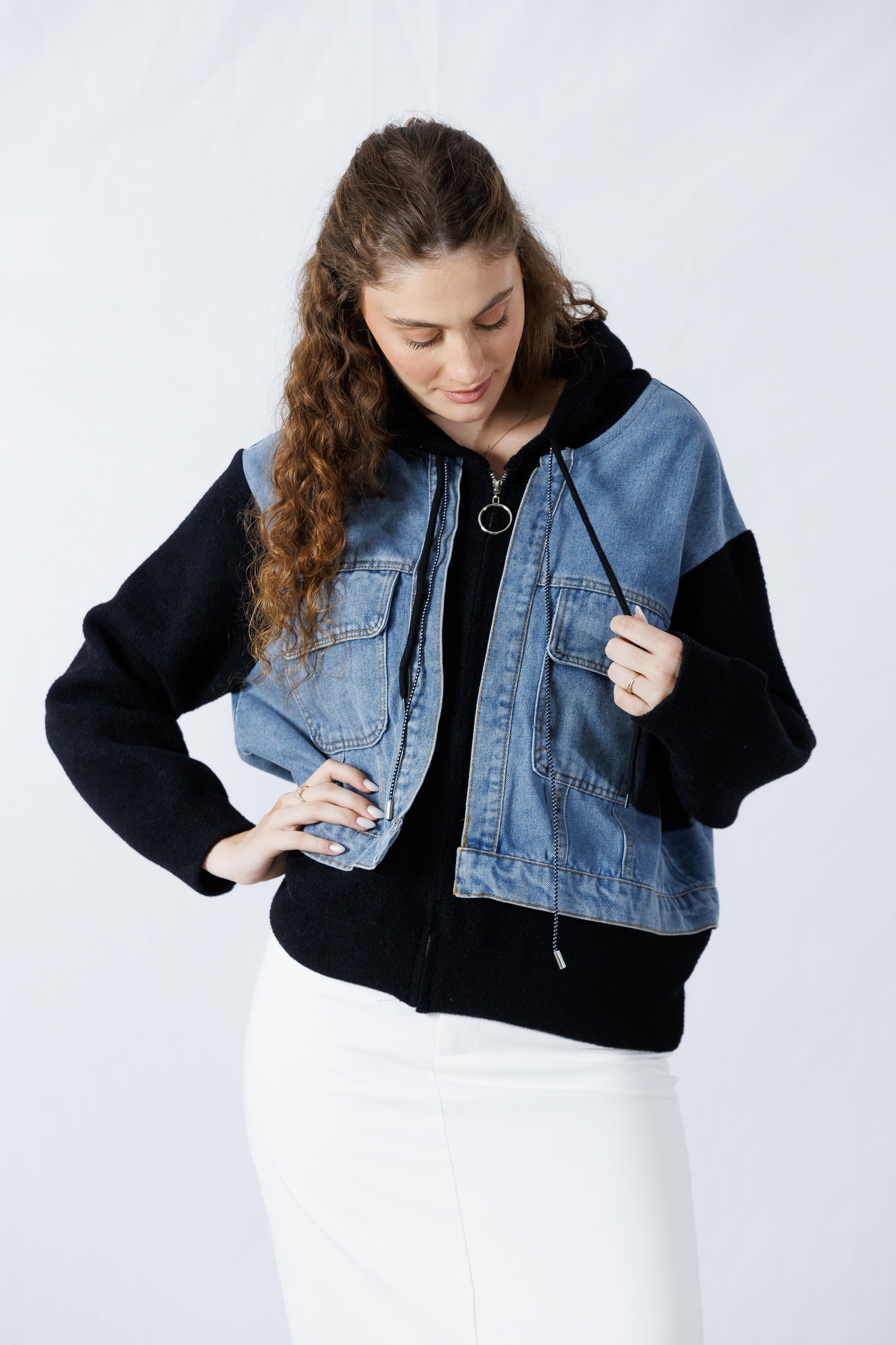ג׳קט “תמר” הוא פריט ייחודי באווירת אוברסייז, המשלב בין בד ג׳ינס כחול קלאסי לבין שרוולים מבד פוטר נעים. עם כובע מחובר ותפרים מודגשים.