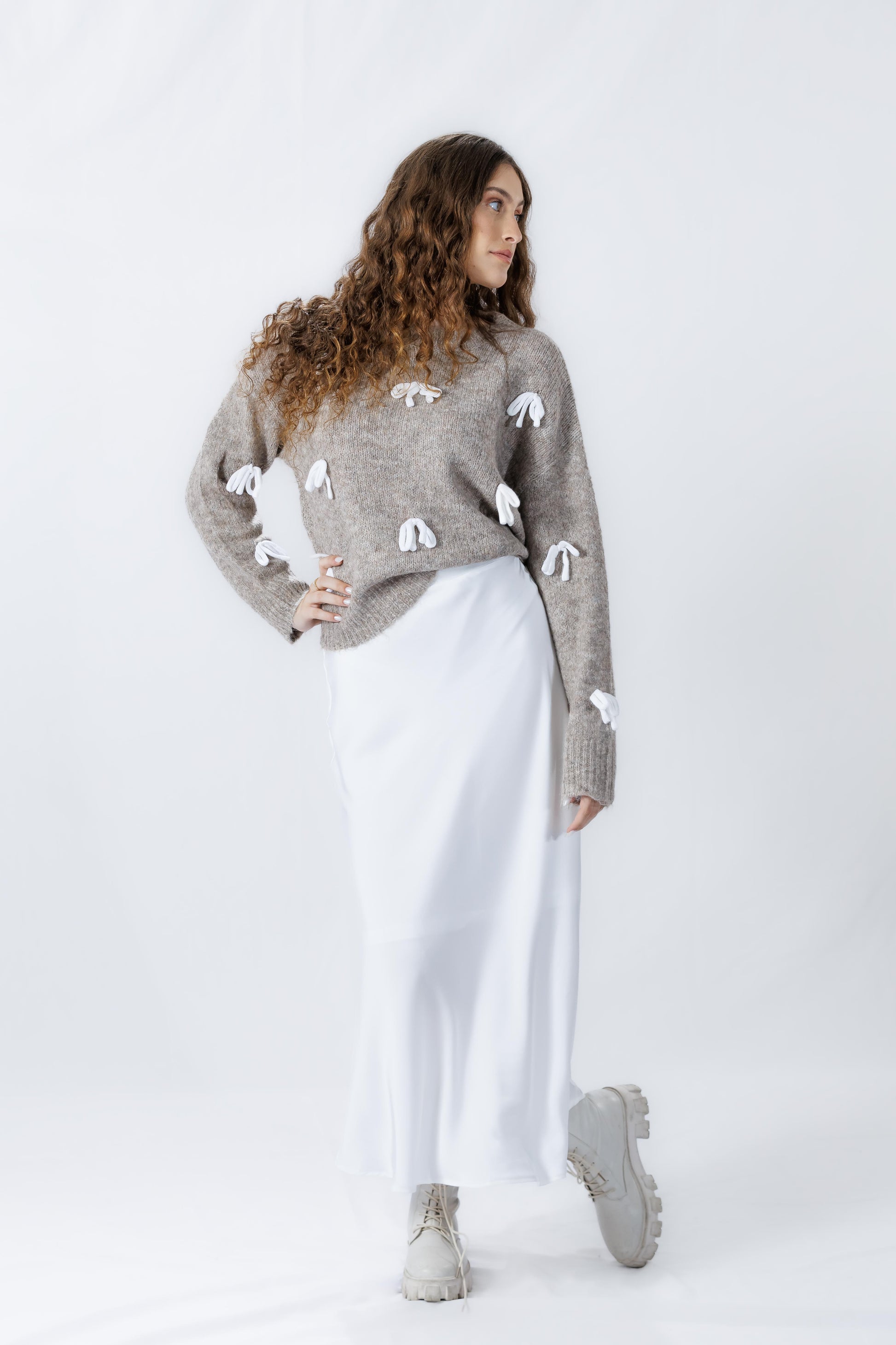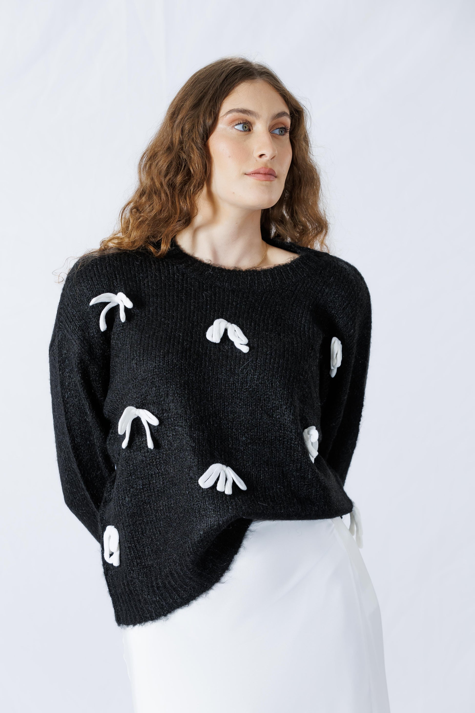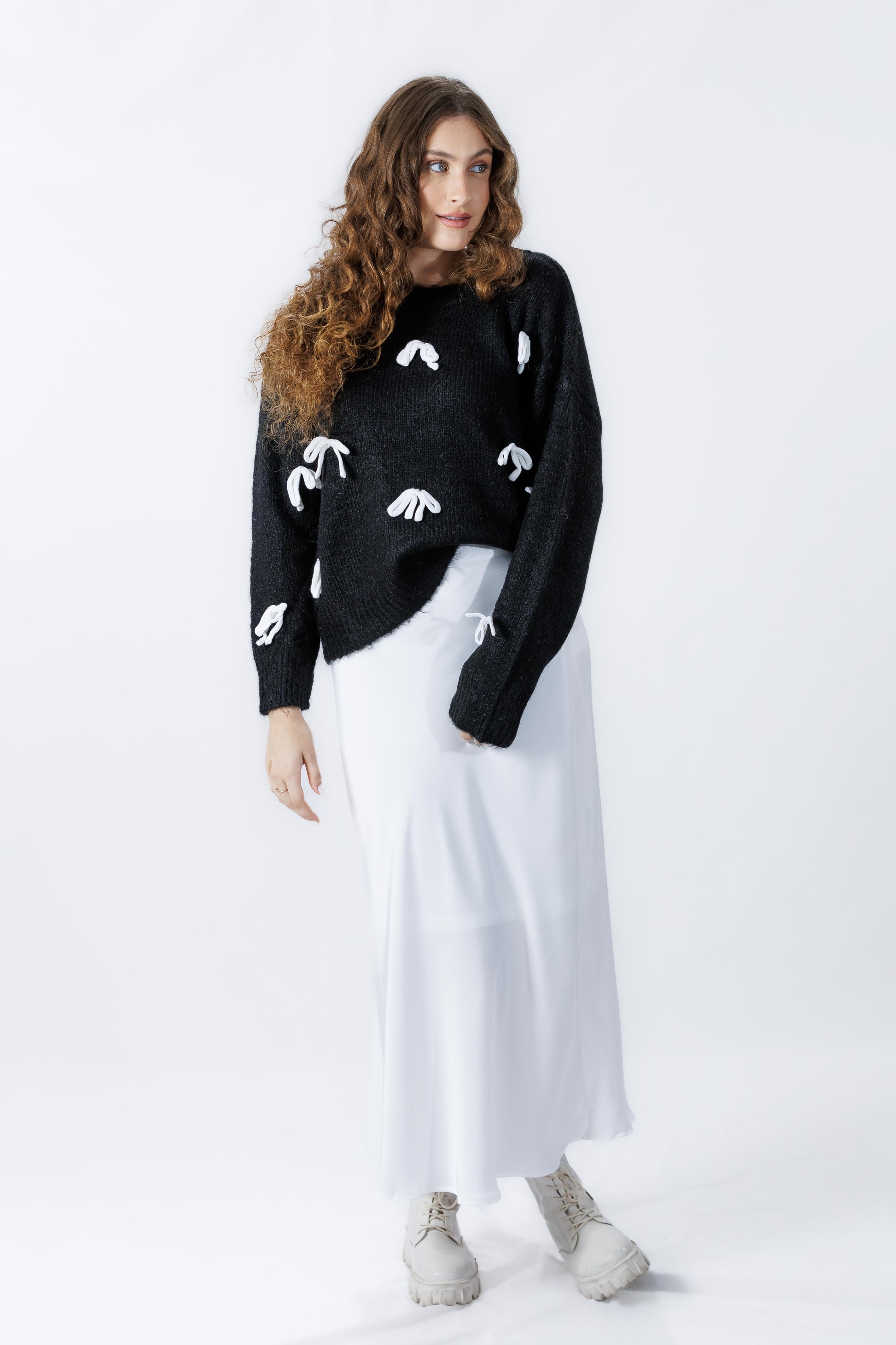 חולצת “שיר” היא חולצת סריג אופנתית ונעימה למגע, עם עיצוב אוברסייז מחמיא. החולצה מעוטרת בפפיונים לבנים תלת מימד