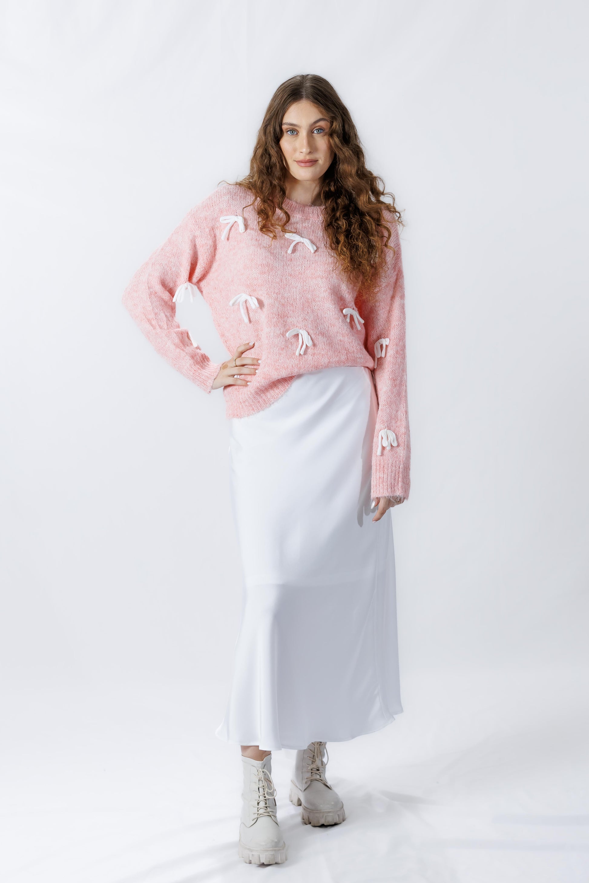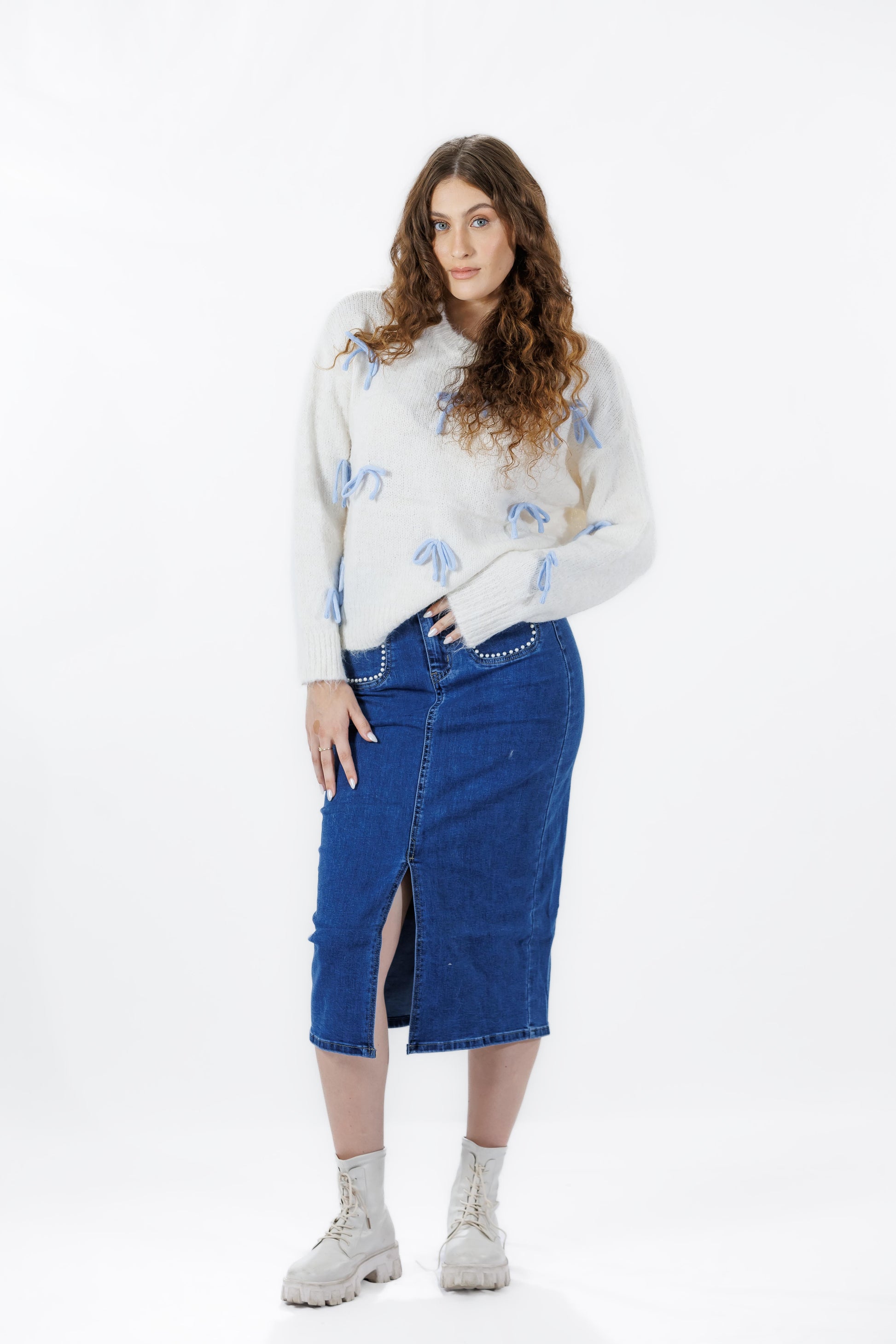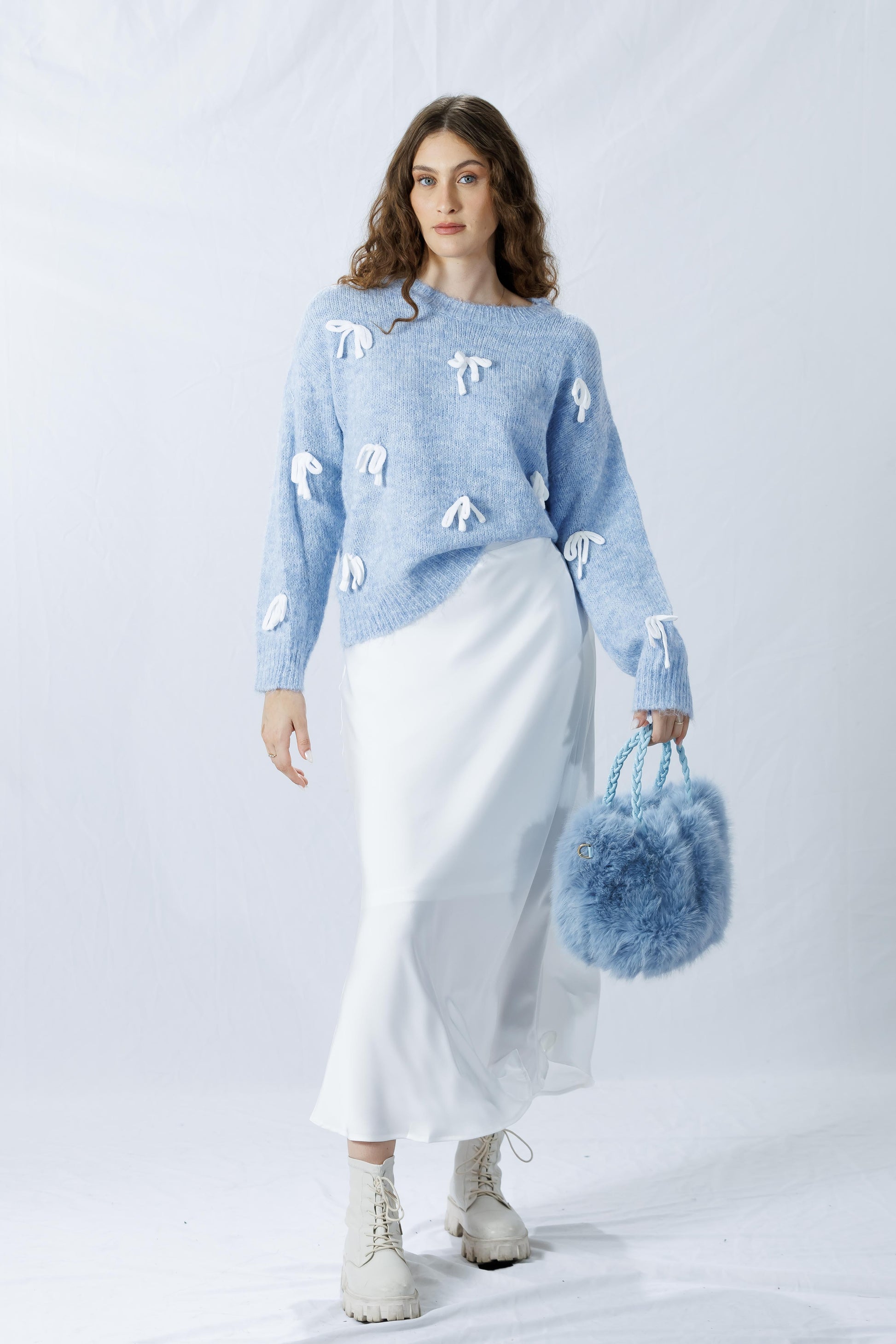 חולצת “שיר” היא חולצת סריג אופנתית ונעימה למגע, עם עיצוב אוברסייז מחמיא. החולצה מעוטרת בפפיונים לבנים תלת מימד